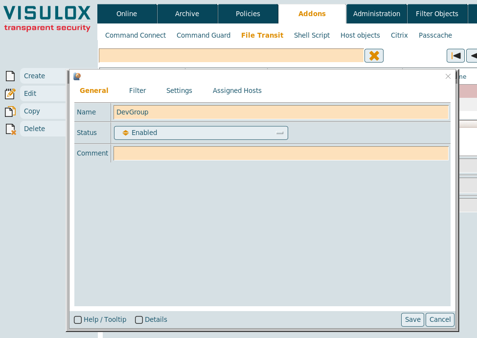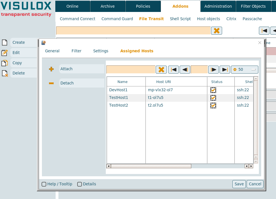 Host objects can be attached / detached from the File Transit group. (See also: Host objects)