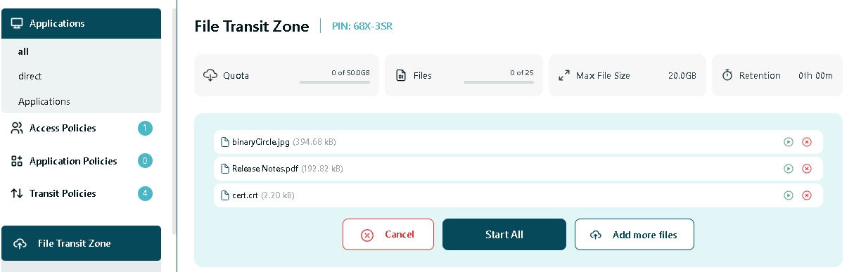 Once the files are uploaded, they are displayed in the "Transit Zone":