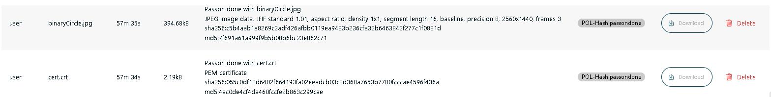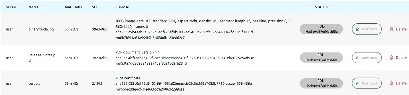 Once the hash file is uploaded to the Transit Zone, the previous uploaded files change their status to "accepted":