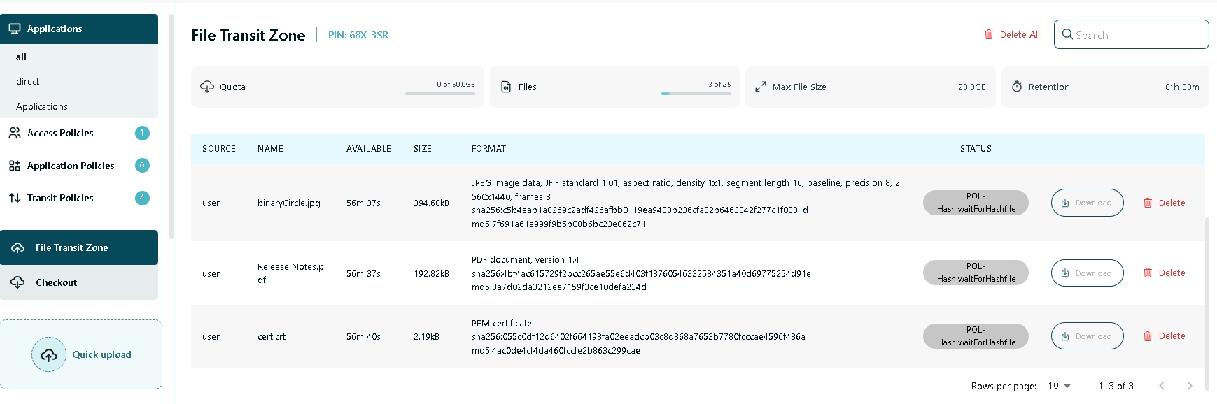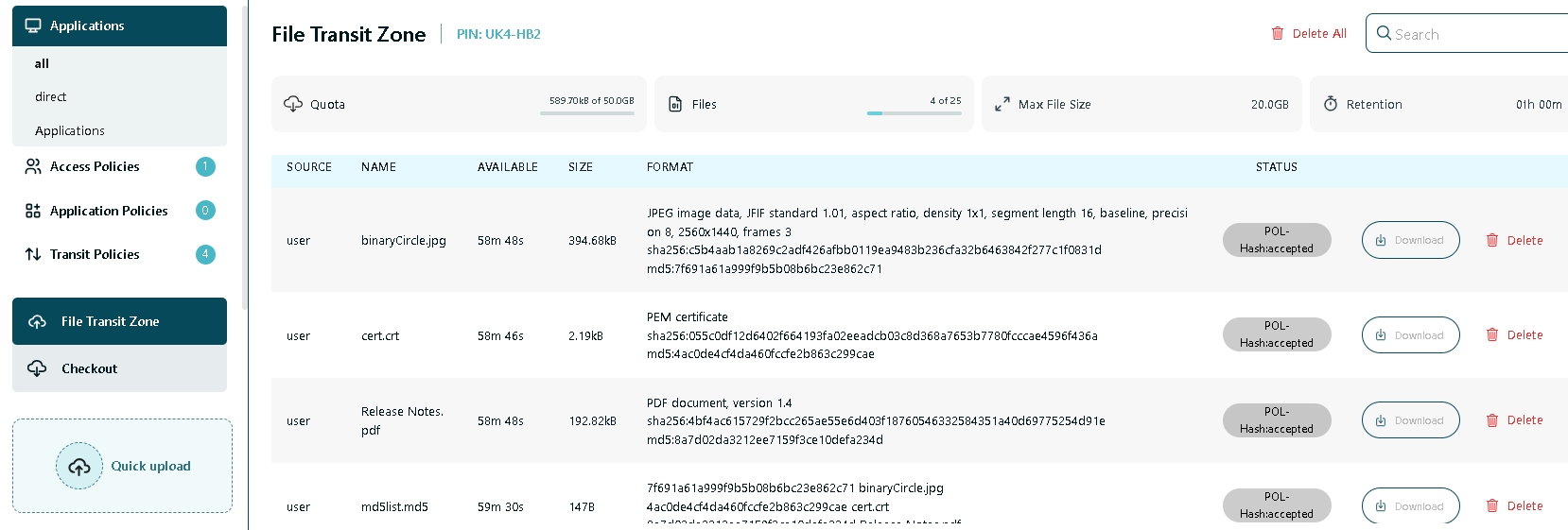 Files matching this policy will be available for further processing, once a file and a hash file with matching hash values are uploaded into the Transit Zone and approval has been done.