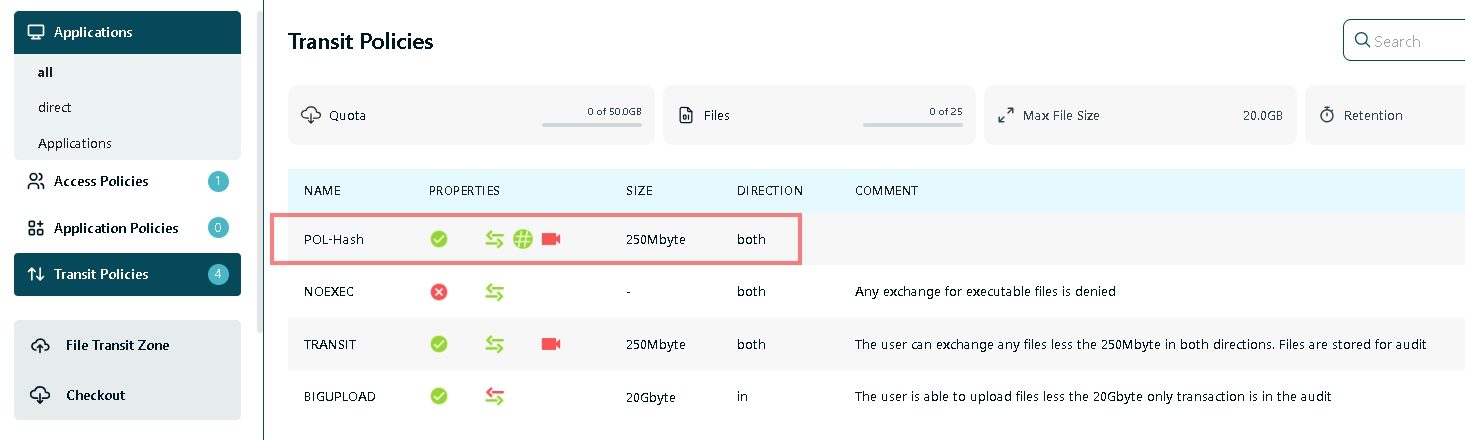 In the "Transit Policies" section all policies of the current user and details about file transit are listed: