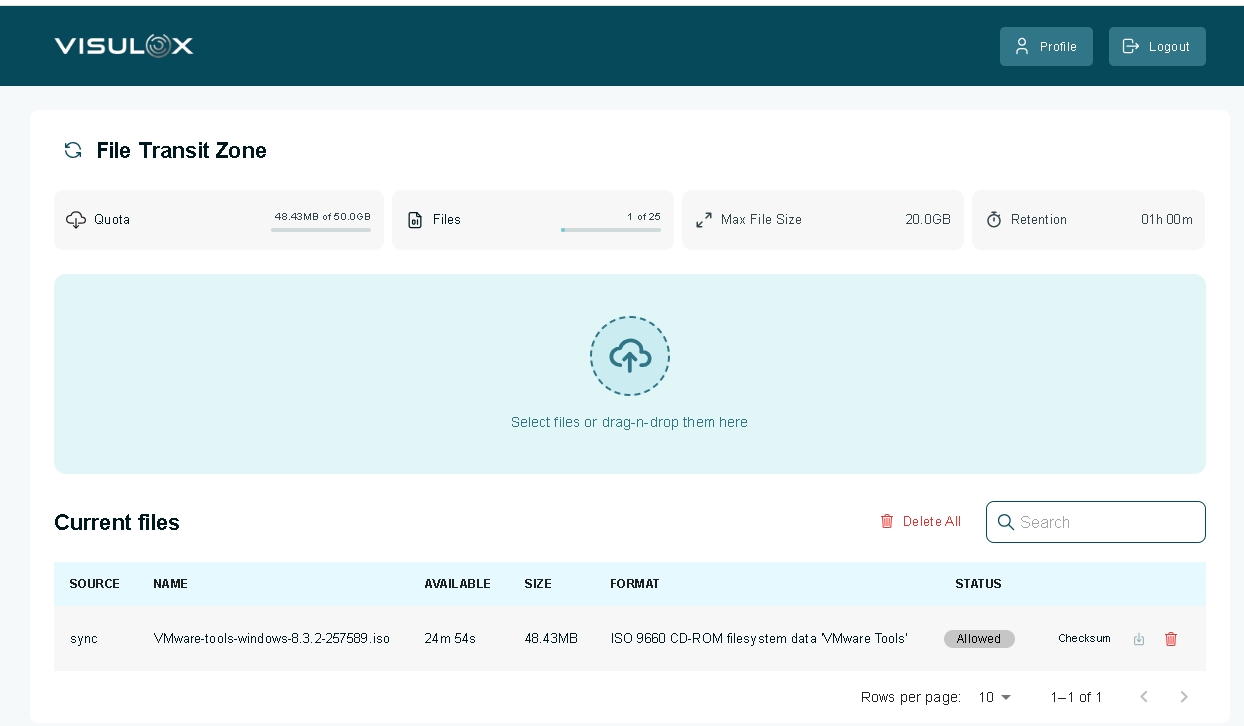 OverviewThe VISULOX File Exchange frontend can be reached via web access from an internal server using a browser. The user can connect to every VISULOX node, using the internal WEB browser and a known URL. The WEB Access PIN is needed to see the Transit Zone. It may be necessary to add the URL for File Exchange to the trusted sites in the browser.