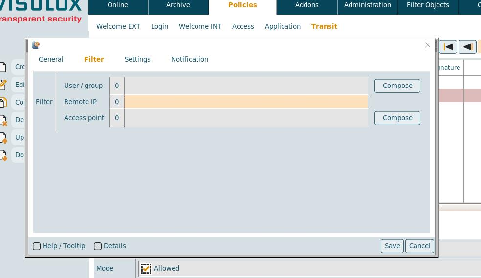 In VISULOX Cockpit / Policies / Transit Policy a new policy has to be created.