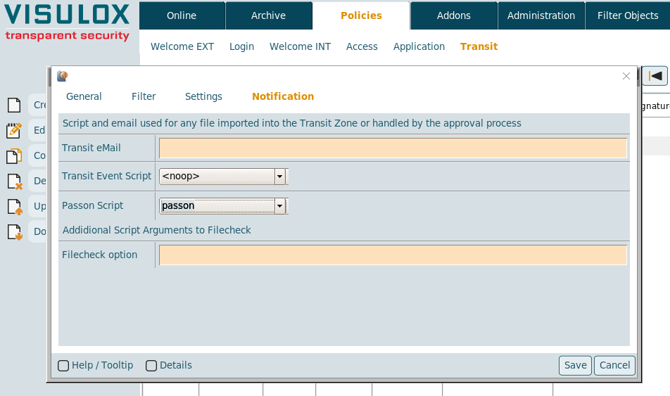 Users are able to upload into the Transit Zone. Depending on the user, file name or file type The configuration is easily done in VISULOX Cockpit / Policies / Transit Policy. The passon script used for the automated transfer can be created or adjusted in |