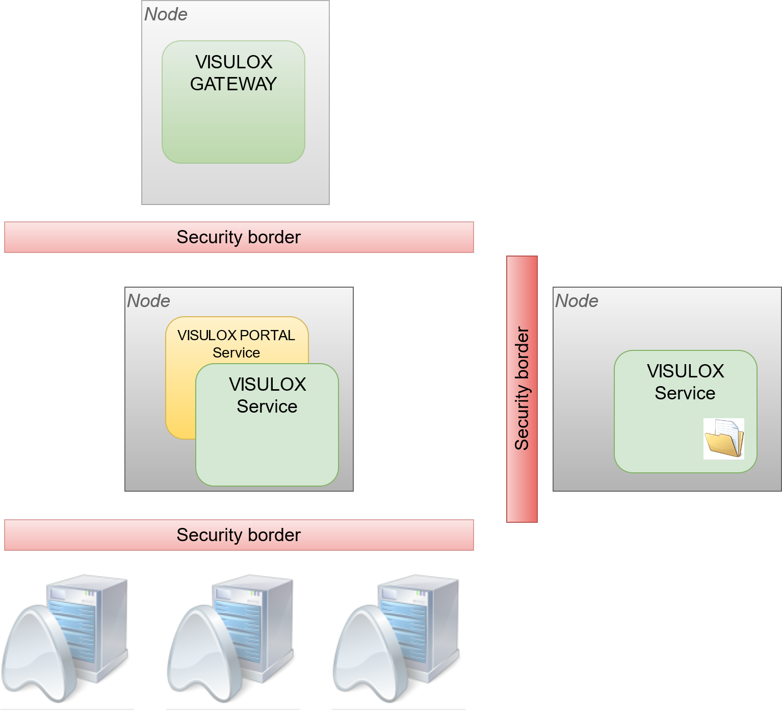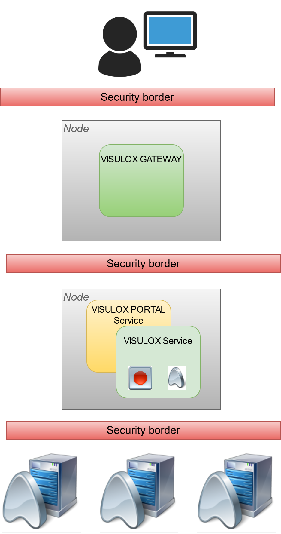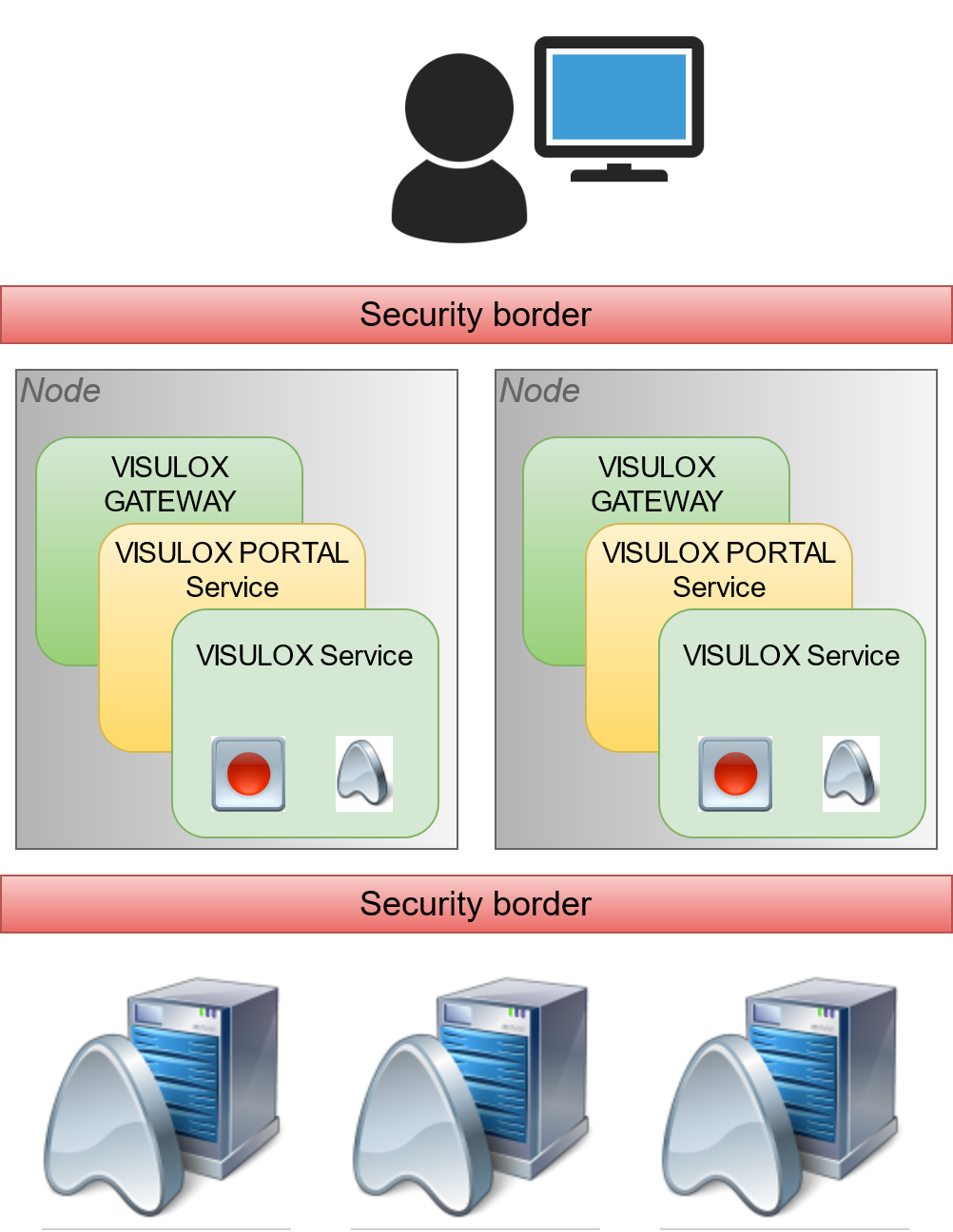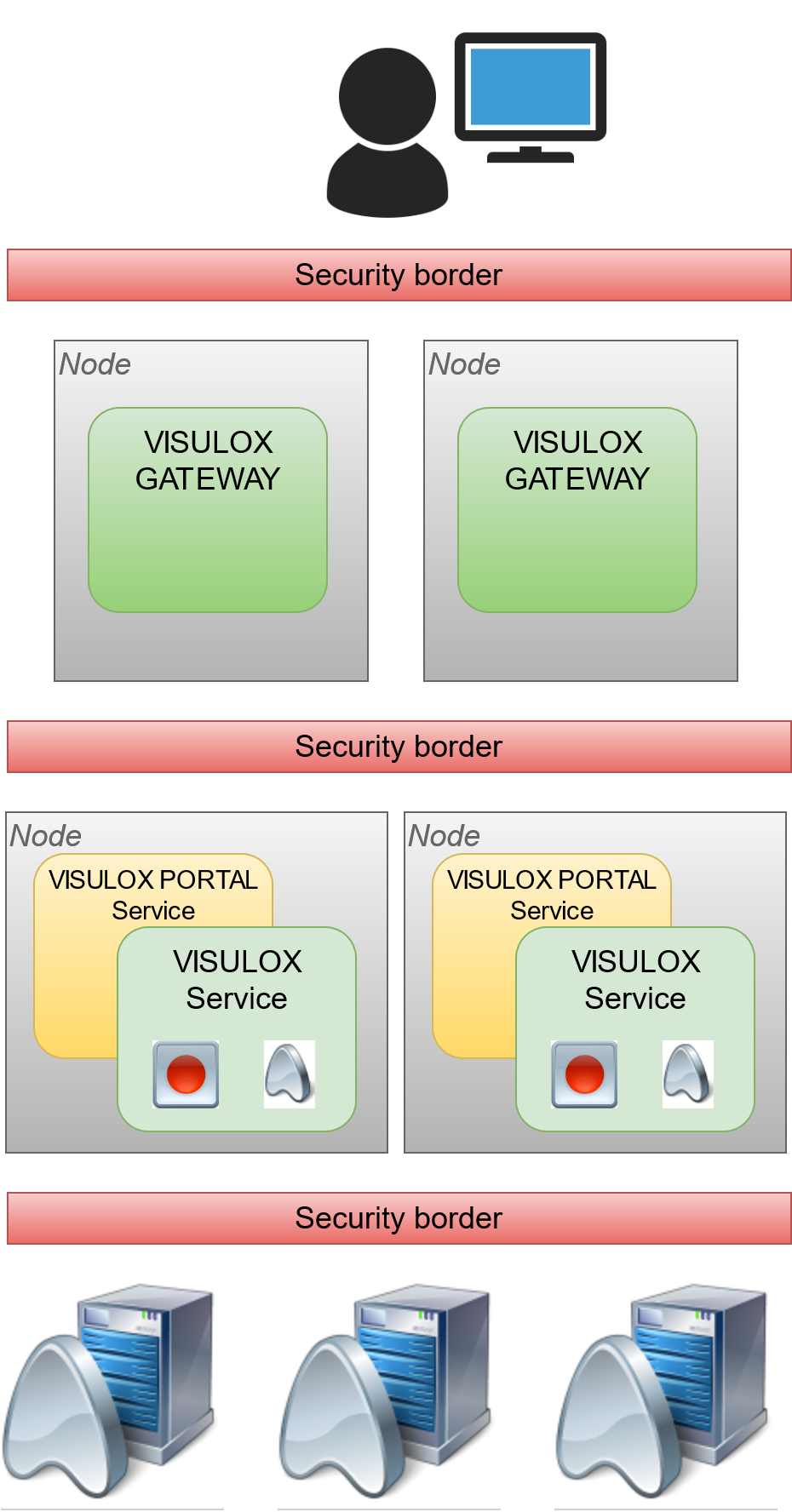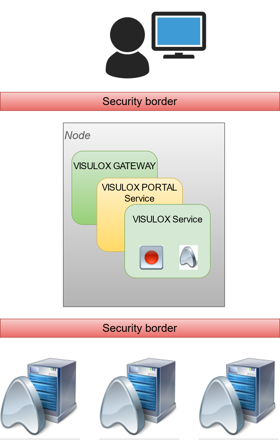 A single node setup is mostly used for POC or setups for less than 25 concurrent users. A redundancy can be guaranteed with the virtualization infrastructure. The node will have three components: VISULOX GATEWAY for pure HTTPS communication with the users, the VISULOX PORTAL Service for application deployment and the VISULOX Service to control the users. |