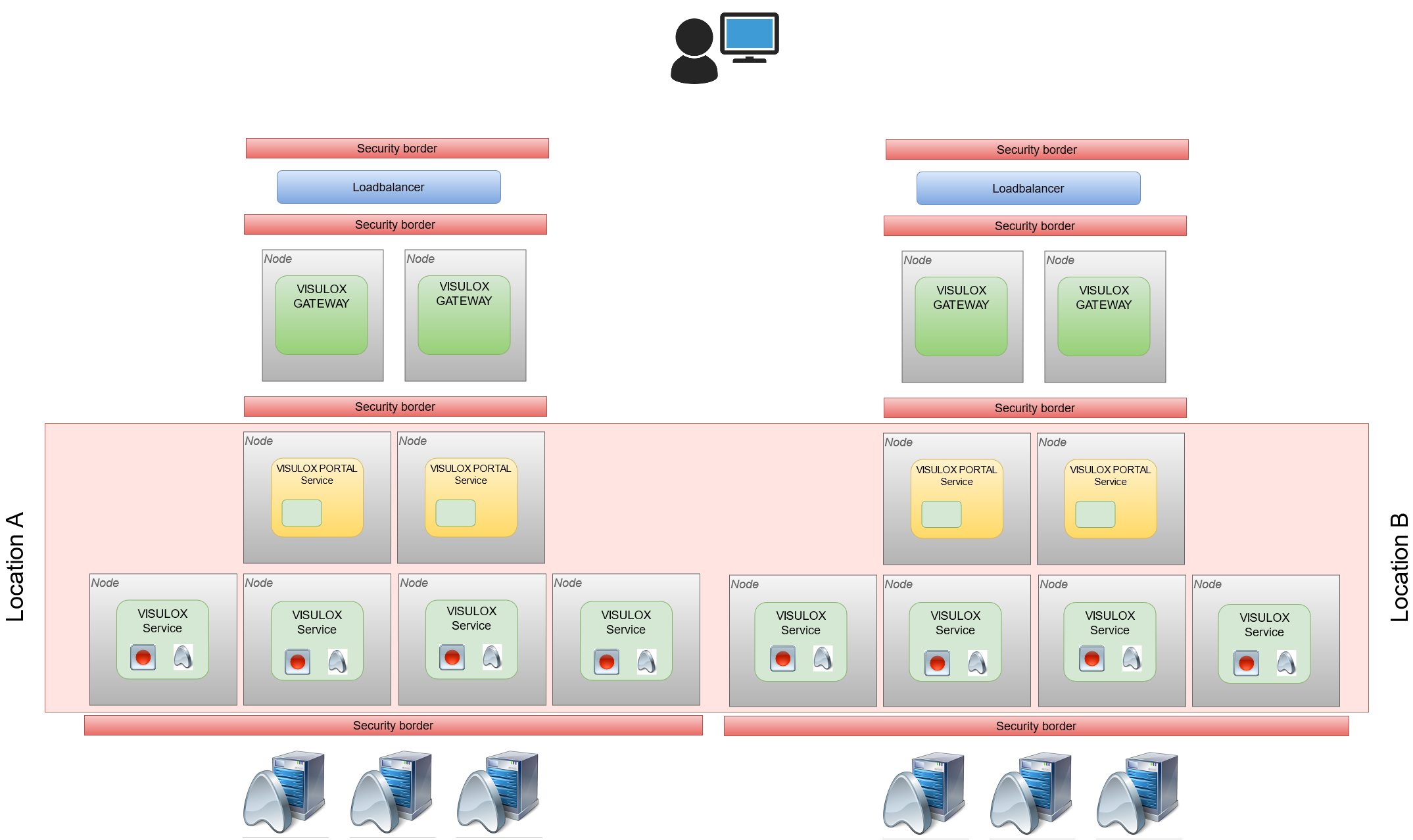 This setup allows to have a first approach in scaling: 25+25+25. The disadvantage is, that the VISULOX GATEWAY load balancing facility is used. User access with DNS and single IP is driven through one VISULOX GATEWAY. This is not a problem, because the sessions through the VISULOX GATEWAY has If one node goes down, the user can access using an alternate DNS name. Using DNS with multiple IP addresses allows additional distributes of the request, but mostly the DNS server does not take care of the availability of a service behind an IP address. This drawing repesents the setup with two nodes. It is possible to have up to 10 nodes. |